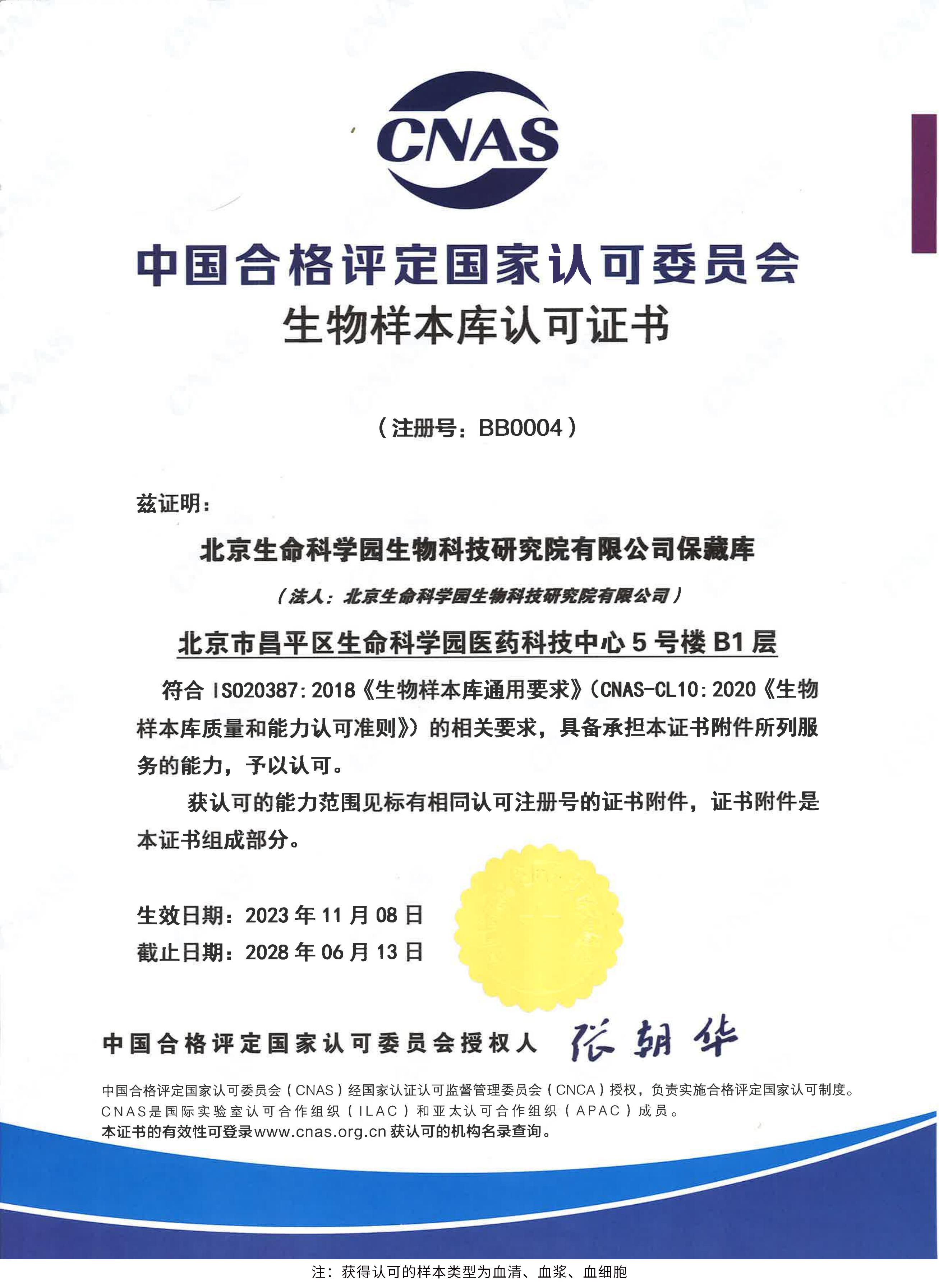 北京生命科學(xué)園生物科技研究院(以下簡稱“北京生物樣本資源庫”)(Biobank of Life Science Park,簡寫“BoLSP”)是一家由北京市科委和中關(guān)村生命科學(xué)園共同支持設(shè)立的第三方生物樣本庫公共服務(wù)平臺(tái),秉承北京重大疾病臨床數(shù)據(jù)和樣本資源庫(以下簡稱“北京庫”)(Beijing Biobank of Clinical Resources,BBCR)十余年的發(fā)展成果,聚合眾多臨床樣本專家的專業(yè)共識(shí),致力于在生命科學(xué)、生物醫(yī)藥研究領(lǐng)域發(fā)揮銜接樣本資源持有者與研究者的橋梁作用,解決生物樣本資源開發(fā)上下游信息不對(duì)稱、資源共享困難等問題。研究院在北京中關(guān)村生命科學(xué)園昌平園區(qū)建立了2000㎡生物樣本庫,最大存儲(chǔ)規(guī)模達(dá)1000萬份。研究院遵循CNAS-CL10:2020《生物樣本庫質(zhì)量和能力認(rèn)可準(zhǔn)則》,同時(shí)結(jié)合北京庫過去十年的工作經(jīng)驗(yàn)與教訓(xùn),建立了一套完善的生物樣本保藏質(zhì)量管理體系,從人、機(jī)、料、法、環(huán)、控多個(gè)角度,實(shí)現(xiàn)生物樣本保藏過程的全面質(zhì)量控制,先后獲得國家科技部頒發(fā)的人類遺傳資源保藏行政許可證書和中國合格評(píng)定國家認(rèn)可委員會(huì)(China National Accreditation Service for Conformity Assessment,CNAS)頒發(fā)的“CNAS認(rèn)可證書”。